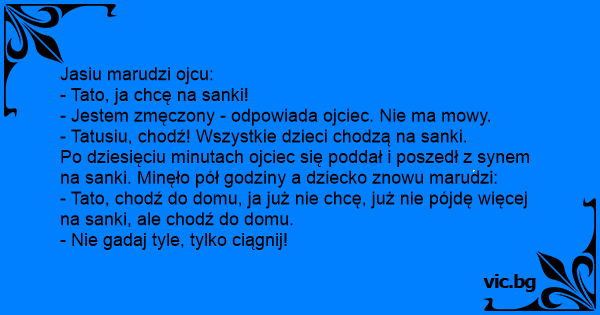 Po dziesięciu minutach ojciec się poddał i poszedł z synem na sanki. Minęło pół godziny a dziecko znowu marudzi: