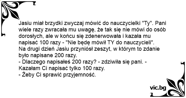 Jasiu miał brzydki zwyczaj mówić do nauczycielki "Ty". Pani wiele razy zwracała mu uwagę, że tak się nie mówi do osób dorosłych, ale w końcu się zdenerwowała i kazała mu napisać 100 razy - "Nie będę mówił TY do nauczycieli".