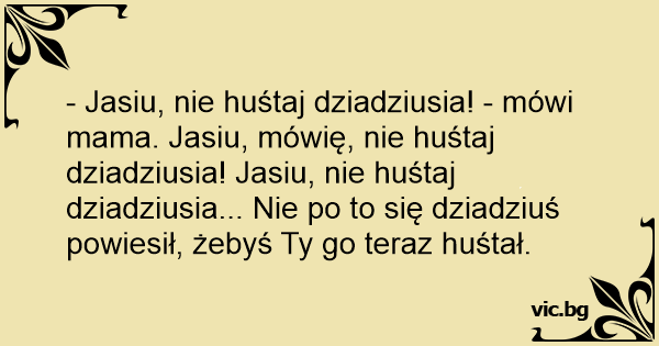 - Jasiu, nie huśtaj dziadziusia! - mówi mama. Jasiu, mówię, nie huśtaj dziadziusia! Jasiu, nie huśtaj dziadziusia... Nie po to się dziadziuś powiesił, żebyś Ty go teraz huśtał.