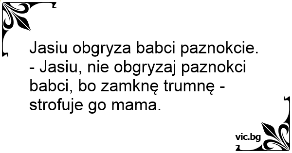 Jasiu obgryza babci paznokcie.<br />- Jasiu, nie obgryzaj paznokci babci, bo zamknę trumnę - strofuje go mama.