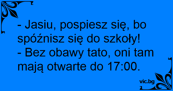 - Иванчо, хайде побързай малко, ще закъснеем за училище! - Споко тате, то е отворено до 5 часа.