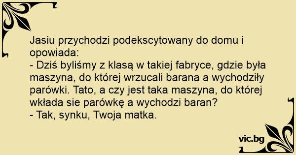 - Dziś byliśmy z klasą w takiej fabryce, gdzie była maszyna, do której wrzucali barana a wychodziły parówki. Tato, a czy jest taka maszyna, do której wkłada sie parówkę a wychodzi baran?