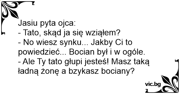 Przychodzi mały Jasiu do taty i pyta: - Jak ja się znalazłem na świecie? Tata myśli co mu powiedzieć. - Jasiu, bocian Cię przyniósł. - Tato, czemu Ty jesteś taki głupi? - Jasiu, dlaczego tak...