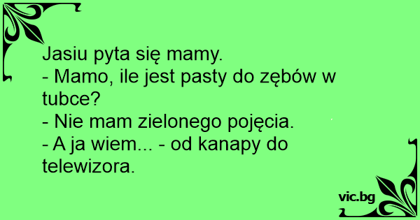 - Mamo, ile jest pasty do zębów w tubie? - Nie mam pojęcia, syneczku. - A ja wiem! Od telewizora do kanapy!