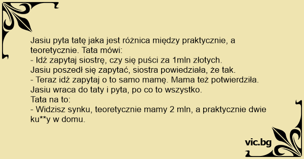 Jasiu pyta tatę jaka jest różnica między praktycznie, a teoretycznie. Tata mówi: