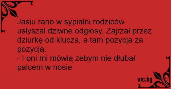 Jasiu rano w sypialni rodziców usłyszał dziwne odgłosy. Zajrzał przez dziurkę od klucza, a tam pozycja za pozycją.
