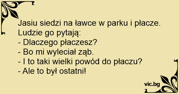 Jasiu siedzi na ławce w parku i płacze. Ludzie go pytają: