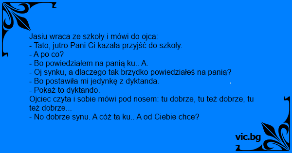 Jasiu wraca ze szkoły i mówi do ojca: