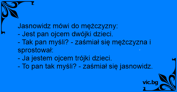 Igen, igen, látom. Ön 2 gyönyörű gyermek édesapja - mondja a jósnő. - Nem kérem, nekem 3 gyerekem van. - Azt maga csak hiszi!