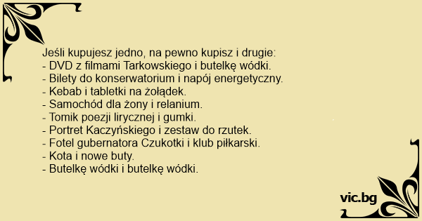 Jeśli kupujesz jedno, na pewno kupisz i drugie: - DVD z filmami Tarkowskiego i butelkę wódki. - Bilety do konserwatorium i napój energetyczny. - Kebab i tabletki na żołądek. - Samochód dla żony i relanium. - Tomik poezji lirycznej i gumki. - Portret Kaczyńskiego i zestaw do rzutek. - Fotel gubernatora Czukotki i klub piłkarski. - Kota i nowe buty. - Butelkę wódki i butelkę wódki.