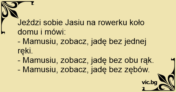 Brauc puisītis ar divriteni un sauc: - Mammu, skaties, es braucu bez rokām! Puisītis nogriežas aiz stūra, pēc laika atgriežas: - Mammu, skaties, es braucu bez zobiem!
