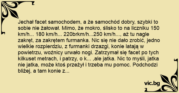 Jechał facet samochodem, a że samochód dobry, szybki to sobie nie żałował. Mimo, że mokro, ślisko to na liczniku 150 km/h... 180 km/h... 220brkm/h...250 km/h..., aż tu nagle zakręt, za zakrętem furmanka. Nic się nie dało zrobić, jedno wielkie rozpierdziu, z furmanki drzazgi, konie latają w powietrzu, woźnicy urwało nogi. Zatrzymał się facet po tych kilkuset metrach, i patrzy, o k... ,ale jatka. Nic to myśli, jatka nie jatka, może ktoś przeżył i trzeba mu pomoc. Podchodzi bliżej, a tam konie z bebechami na wierzchu, ledwo dychają. Jakoś trzeba by je dobić, co się ma gadzina męczyć. Złapał za siekierę, która wypadła z furmanki i do jednego konia, do drugiego... pozarąbywał na śmierć. Stoi i rozgląda się, co dalej, zauważył woźnice. Woźnica na to, podciągając koc i przykrywając urwane nogi: