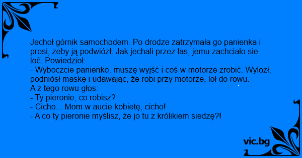 Jechoł górnik samochodem. Po drodze zatrzymała go panienka i prosi, żeby ją podwiózł. Jak jechali przez las, jemu zachciało sie loć. Powiedzioł: