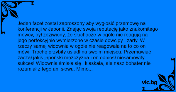 Jeden facet został zaproszony aby wygłosić przemowę na konferencji w Japonii. Znając swoja reputację jako znakomitego mówcy, był zdziwiony, że słuchacze w ogóle nie reagują na jego perfekcyjnie wymierzone w czasie dowcipy i żarty. W rzeczy samej widownia w ogóle nie reagowała na to co on mówi. Trochę przybity usiadł na swoim miejscu. Przemawiać zaczął jakiś japoński mężczyzna i on odniósł niesamowity sukces! Widownia śmiała się i klaskała, ale nasz bohater nie rozumiał z tego ani słowa. Mimo to począł bić mu brawo, bo widocznie na to zasłużył swoją perfekcyjną przemową. Przerwał mu jednak przewodniczący konferencji: