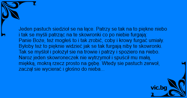 Jeden pastuch siedzioł se na łące. Patrzy se tak na to piękne niebo i tak se myśli patrząc na te skowronki co po niebie furgają: