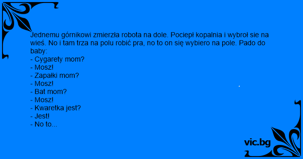 Jednemu górnikowi zmierzła robota na dole. Pociepł kopalnia i wybroł sie na wieś. No i tam trza na polu robić pra, no to on się wybiero na pole. Pado do baby: