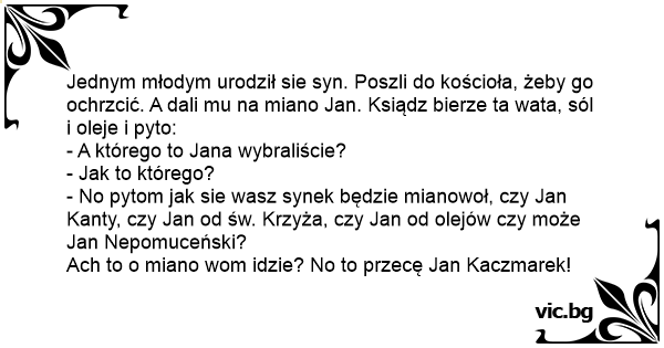 - No pytom jak sie wasz synek będzie mianowoł, czy Jan Kanty, czy Jan od św. Krzyża, czy Jan od olejów czy może Jan Nepomuceński?