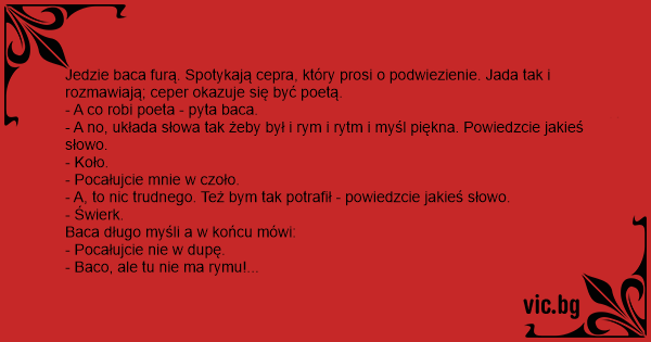 Jedzie baca furą. Spotykają cepra, który prosi o podwiezienie. Jada tak i rozmawiają; ceper okazuje się być poetą.