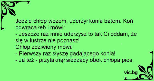 Jedzie chłop wozem, uderzył konia batem. Koń odwraca łeb i mówi: