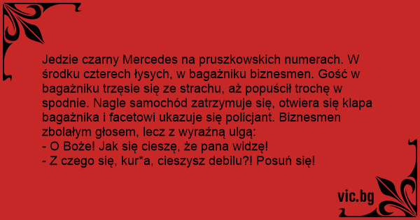 Jedzie czarny Mercedes na pruszkowskich numerach. W środku czterech łysych, w bagażniku biznesmen. Gość w bagażniku trzęsie się ze strachu, aż popuścił trochę w spodnie. Nagle samochód zatrzymuje się, otwiera się klapa bagażnika i facetowi ukazuje się policjant. Biznesmen zbolałym głosem, lecz z wyraźną ulgą: