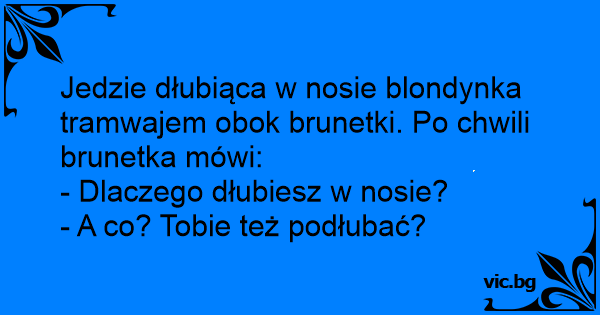 Jedzie dłubiąca w nosie blondynka tramwajem obok brunetki. Po chwili brunetka mówi: