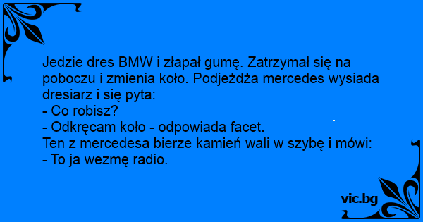 Jedzie dresiarz Bmw. Jedzie 100 km, 200 km, aż na 300 km łapie gumę. No więc wymienia koło. Podjeżdża drugi dresiarz mercem i pyta: - Co robisz? - Odkręcam koło. No więc drugi bierze kamień, wybija...
