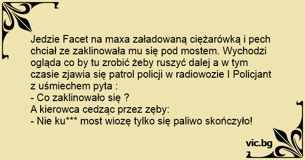 Jedzie Facet na maxa załadowaną ciężarówką i pech chciał ze zaklinowała mu się pod mostem. Wychodzi ogląda co by tu zrobić żeby ruszyć dalej a w tym czasie zjawia się patrol policji w radiowozie I Policjant z uśmiechem pyta :