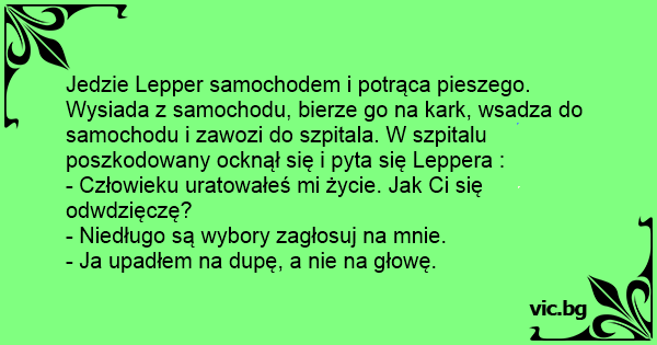 Jedzie Lepper samochodem i potrąca pieszego. Wysiada z samochodu, bierze go na kark, wsadza do samochodu i zawozi do szpitala. W szpitalu poszkodowany ocknął się i pyta się Leppera :