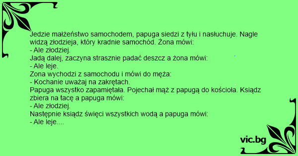 Jedzie małżeństwo samochodem, papuga siedzi z tyłu i nasłuchuje. Nagle widzą złodzieja, który kradnie samochód. Żona mówi: