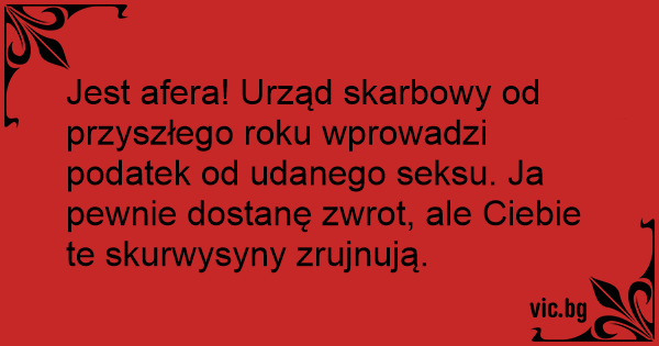 Jest afera! Urząd skarbowy od przyszłego roku wprowadzi podatek od udanego seksu. Ja pewnie dostanę zwrot, ale Ciebie te skurwysyny zrujnują.