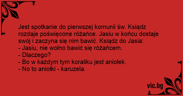 Jest spotkanie do pierwszej komunii św. Ksiądz rozdaje poświęcone różańce. Jasiu w końcu dostaje swój i zaczyna się nim bawić. Ksiądz do Jasia: