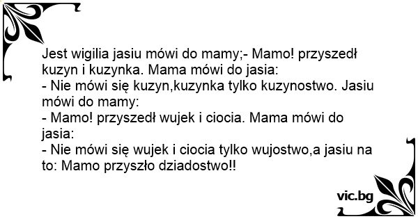 Jest wigilia jasiu mówi do mamy;- Mamo! przyszedł kuzyn i kuzynka. Mama mówi do jasia: