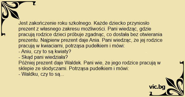 Sytuacja powtarza się kilkanaście razy. Pani zawsze bez problemu zgaduje co dostała. Jako ostatni daje prezent Jasio. Pani wie, że jego rodzice pracują w branży monopolowej. Nim potrząsnęła pudełkiem zauważyła, że z pudełka coś wycieka. Postanowiła to polizać.