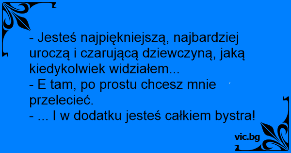 Он: Ти си најсимпатичната, и најубавата девојка што сум ја видел! Она: Ма не сери, само сакаш да ме е*еш или! Он: Ооо, па ти си била и паметна...