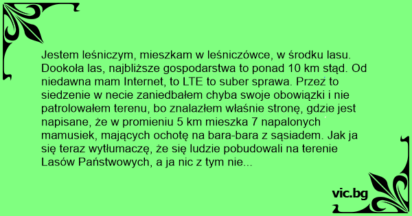 Jestem leśniczym, mieszkam w leśniczówce, w środku lasu. Dookoła las, najbliższe gospodarstwa to ponad 10 km stąd. Od niedawna mam Internet, to LTE to suber sprawa. Przez to siedzenie w necie zaniedbałem chyba swoje obowiązki i nie patrolowałem terenu, bo znalazłem właśnie stronę, gdzie jest napisane, że w promieniu 5 km mieszka 7 napalonych mamusiek, mających ochotę na bara-bara z sąsiadem. Jak ja się teraz wytłumaczę, że się ludzie pobudowali na terenie Lasów Państwowych, a ja nic z tym nie zrobiłem?!
