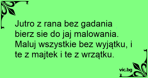 Jutro z rana bez gadania bierz sie do jaj malowania. Maluj wszystkie bez wyjątku, i te z majtek i te z wrzątku.