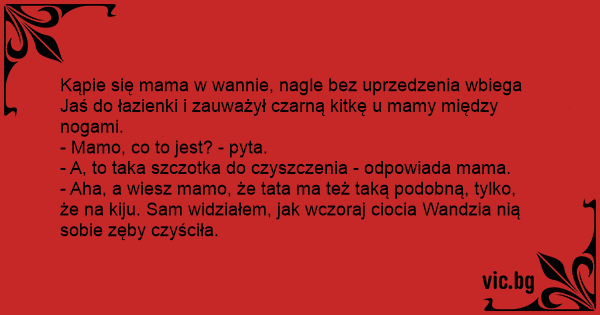 Kąpie się mama w wannie, nagle bez uprzedzenia wbiega Jaś do łazienki i zauważył czarną kitkę u mamy między nogami.