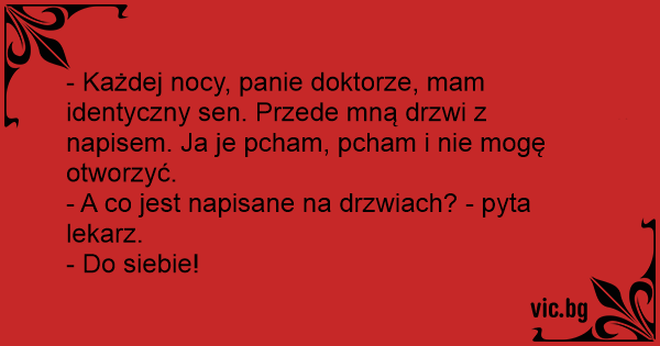 - Każdej nocy, panie doktorze, mam identyczny sen. Przede mną drzwi z napisem. Ja je pcham, pcham i nie mogę otworzyć.