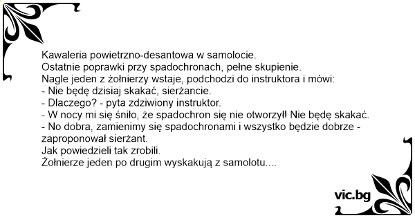 - No dobra, zamienimy się spadochronami i wszystko będzie dobrze - zaproponował sierżant.