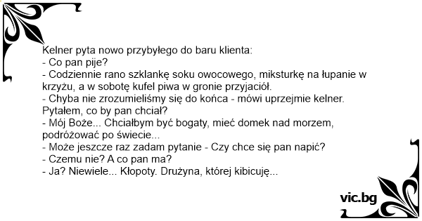 - Chyba nie zrozumieliśmy się do końca - mówi uprzejmie kelner. Pytałem, co by pan chciał?