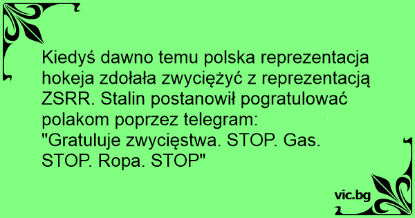 Kiedyś dawno temu polska reprezentacja hokeja zdołała zwyciężyć z reprezentacją ZSRR. Stalin postanowił pogratulować polakom poprzez telegram: