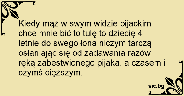 Kiedy mąż w swym widzie pijackim chce mnie bić to tulę to dziecię 4-letnie do swego łona niczym tarczą osłaniając się od zadawania razów ręką zabestwionego pijaka, a czasem i czymś cięższym.