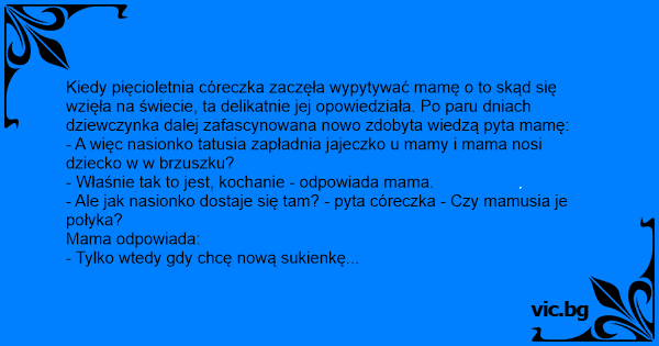 Kiedy pięcioletnia córeczka zaczęła wypytywać mamę o to skąd się wzięła na świecie, ta delikatnie jej opowiedziała. Po paru dniach dziewczynka dalej zafascynowana nowo zdobyta wiedzą pyta mamę:
