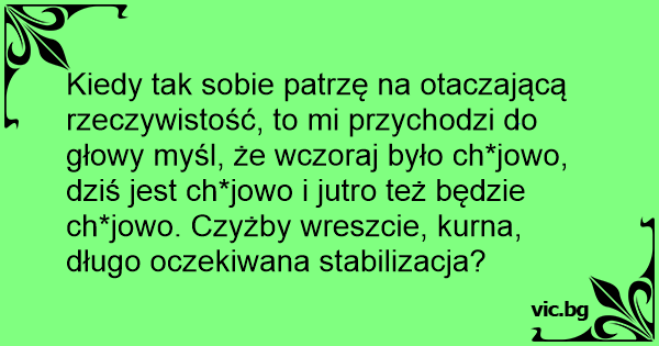 Kiedy tak sobie patrzę na otaczającą rzeczywistość, to mi przychodzi do głowy myśl, że wczoraj było ch*jowo, dziś jest ch*jowo i jutro też będzie ch*jowo. Czyżby wreszcie, kurna, długo oczekiwana stabilizacja?