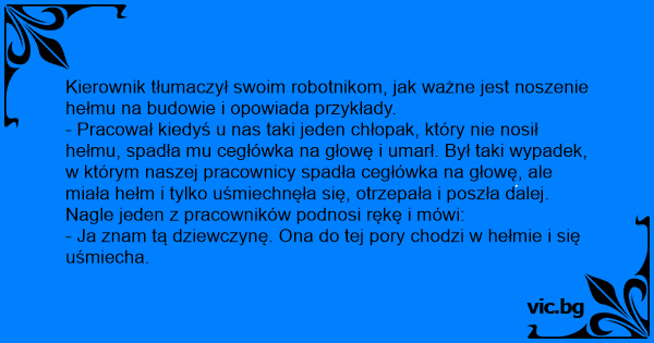 - Pracował kiedyś u nas taki jeden chłopak, który nie nosił hełmu, spadła mu cegłówka na głowę i umarł. Był taki wypadek, w którym naszej pracownicy spadła cegłówka na głowę, ale miała hełm i tylko uśmiechnęła się, otrzepała i poszła dalej. Nagle jeden z pracowników podnosi rękę i mówi: