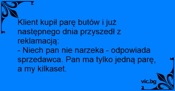 - Niech pan nie narzeka - odpowiada sprzedawca. Pan ma tylko jedną parę, a my kilkaset.