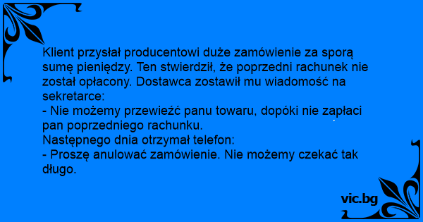 Klient przysłał producentowi duże zamówienie za sporą sumę pieniędzy. Ten stwierdził, że poprzedni rachunek nie został opłacony. Dostawca zostawił mu wiadomość na sekretarce: