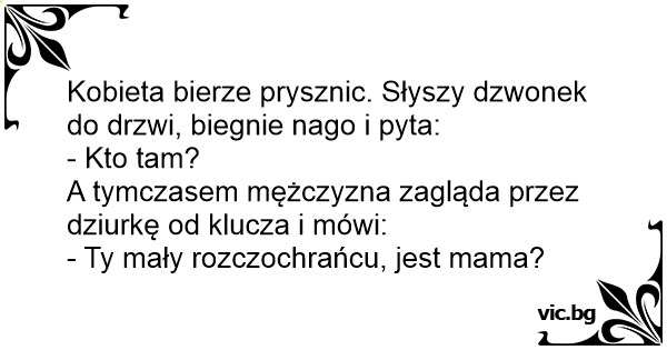 Kobieta bierze prysznic. Słyszy dzwonek do drzwi, biegnie nago i pyta: