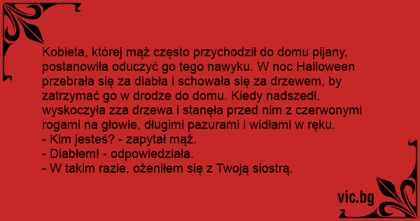 Kobieta, której mąż często przychodził do domu pijany, postanowiła oduczyć go tego nawyku. W noc Halloween przebrała się za diabła i schowała się za drzewem, by zatrzymać go w drodze do domu. Kiedy nadszedł, wyskoczyła zza drzewa i stanęła przed nim z czerwonymi rogami na głowie, długimi pazurami i widłami w ręku.