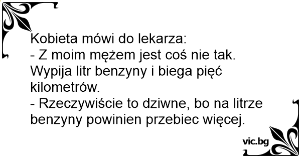 - Z moim mężem jest coś nie tak. Wypija litr benzyny i biega pięć kilometrów.